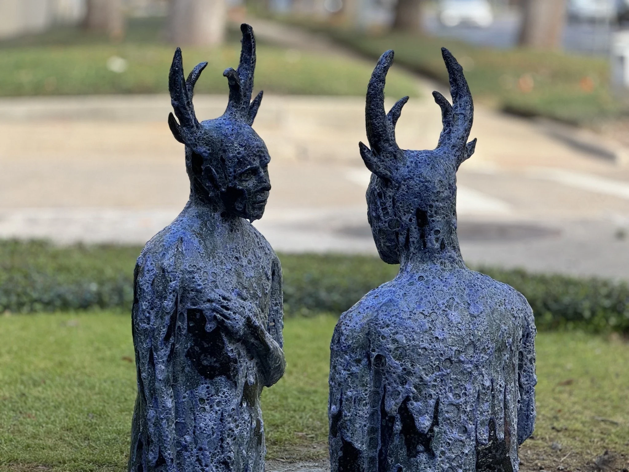 On view through Oct. 31, 2026 on the front sculpture lawn of The Jung Center, 5200 Montrose Boulevard. Made of clay with a flowing blue lava glaze, this piece is about the healing power of listening.